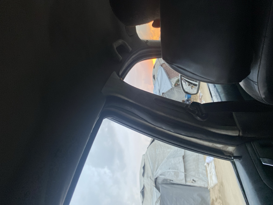 The image is an interior car shot, angled towards the passenger window. The headliner and A-pillar trim are visible, with a grab handle near the top. Outside, a roadside scene is blurred, possibly a tent or shelter, with a person reflected in the side mirror. The sky is overcast, and the light is muted. The interior is dark, highlighting the window view. A seat is partially visible on the right.