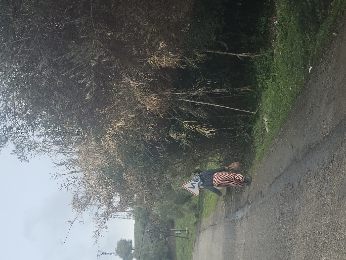 An outdoor scene in Moqrisset, Morocco, depicts a single individual walking on a paved road under an overcast sky. The person, viewed from behind, is wearing a dark top, a light-colored head covering, and a long skirt with orange and white horizontal stripes, carrying a light brown bag in their right hand. They are positioned on the right side of the road, adjacent to a dirt shoulder. A white triangular warning sign with a red border and a black 'S' shaped symbol, indicating a winding road, is visible near the person on the right. To the immediate right of the road is a dense wall of tall, slender-leafed vegetation, some appearing dry or yellowish-brown. Further left in the background, a green, hilly landscape features scattered trees and two utility poles or communication towers. The road surface appears damp in places.