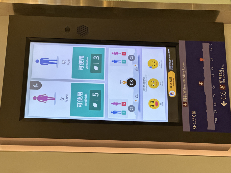 A vertically oriented digital display screen, framed in dark material, is centrally positioned in an indoor public area. The screen provides information regarding restroom availability, facility locations, and a satisfaction survey. The upper section of the display presents restroom status: * A pink female pictogram with "女 Female" text indicates 5 "可使用 Available" female restrooms. A small, dark-grey icon resembling a microscope or laboratory flask is situated above the female pictogram. * A blue male pictogram with "男 Male" text indicates 3 "可使用 Available" male restrooms. The middle section features a simplified map showing three areas: C4, C3, and C2. * A prominent orange pin icon labels C3 as "Here." * To the left, C4 is marked as 1 minute away, with icons showing 3 male and 5 female restrooms. * To the right, C2 is marked as 2 minutes away, also with icons showing 3 male and 5 female restrooms. Below this map, a "Toilet use satisfaction survey" (廁所使用滿意度調查) is presented, offering three interactive emoji options: "Good" (滿意), "Average" (普通), and "Unsatisfactory" (不滿意). A blue button labeled "線上客服 Call Center" is located beneath the survey. The lower section, part of the physical frame below the digital screen, displays navigational information: * A heading reads "哺乳室 Breastfeeding Room." * A floor plan indicates "3F 第二航廈 C區" (3F Terminal 2 C Area), with sections C10 through C1 delineated. * An arrow points left towards "←C6 尿布取用 FREE DIAPERS." Small icons, possibly representing baby care facilities, are visible at C3, C4, and C6. The display is flanked by light-colored, reflective wall surfaces. Based on the "Terminal 2" notation and the prompt, the location is within Taiwan Taoyuan International Airport in Taoyuan City, Taiwan. No individuals are present in the immediate vicinity of the display.