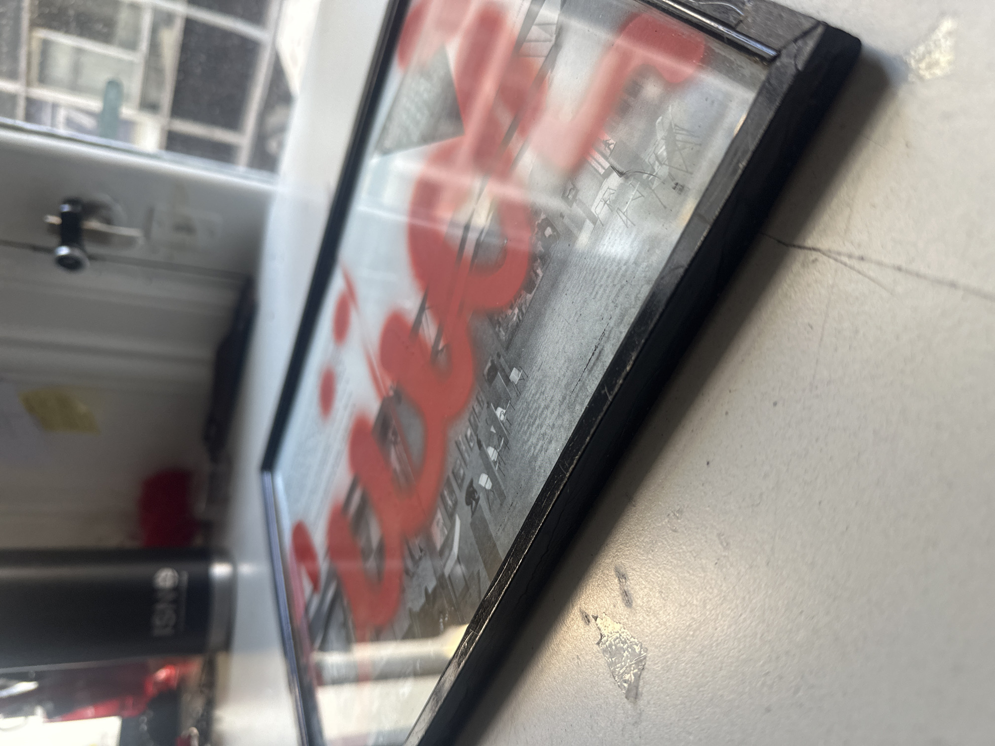 framed black and white picture with overlaid red lettering