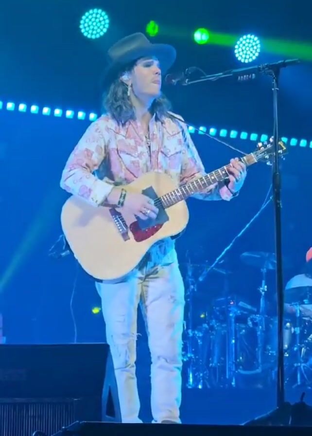 A man is performing on a stage. He is wearing a cowboy hat, a pink floral patterned shirt, and white jeans. He is playing an acoustic guitar and singing into a microphone. The stage is illuminated with blue lights. A drum set is visible in the background, along with another person wearing a bright orange baseball cap.