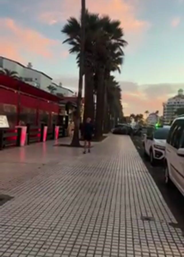 man jogging on a tiled sidewalk lined with palm trees. The sidewalk runs alongside a street with parked cars and buildings, one of which appears to be a restaurant with red awnings. The sky is colorful with hues of pink and blue, suggesting either sunrise or sunset. The man is wearing a dark outfit and jogging towards the camera.