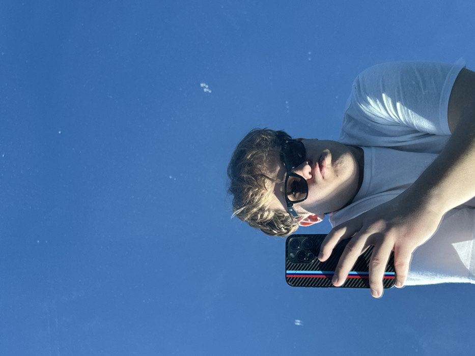 A man with sunglasses and a white t-shirt holds a phone with a carbon fiber case and blue, red, and white stripes. The photo is taken at an angle against a clear blue sky. The man's face and the phone are in focus, while the sky serves as a bright backdrop. The reflection on a surface may be responsible for this perspective.