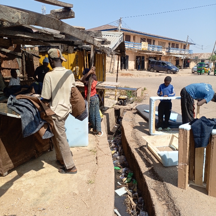 This image captures an outdoor commercial area or street market in Jos, Nigeria, under bright daylight with a clear blue sky. In the immediate foreground, a male subject, wearing a beige t-shirt, khaki pants, and a baseball cap, stands facing slightly away from the camera, handling a brown fabric item. He is positioned near a stall where a pile of textiles, including dark grey/blue and brown fabrics, rests on a white surface. Under the crude, open-fronted stall, constructed from wooden planks and corrugated metal, two other male subjects are partially visible in the background; one is seated in a dark shirt, and another in a white shirt is further back. Adjacent to the stall area, an open concrete drainage gutter, containing visible refuse such as plastic bags and bottles, runs horizontally across the mid-ground. To the right of the first subject, a male in a red long-sleeved shirt and blue jeans stands, holding a long wooden stick vertically. A small, yellow portable generator is situated on the ground near the gutter. Further right, two male subjects are actively engaged in what appears to be upholstery or carpentry work. One subject, wearing a blue long-sleeved athletic top with white arm stripes and dark pants, stands over a partially upholstered frame, manipulating it with his hands. Next to him, another subject in a light blue t-shirt and dark pants is bent over, working on a light brown wooden frame, possibly for furniture, positioned near another upholstered piece. Several light blue foam or upholstery segments are visible on the ground. In the mid-ground, a paved or unpaved street is visible. A dark blue van is parked on the street, and a green and yellow motorized rickshaw (Keke Napep) is partially visible further down the road. The background features several multi-story buildings with light-colored facades (cream, yellow, blue accents), multiple windows, and balconies, suggesting a mixed-use urban environment. Overhead power lines and poles are visible against the clear sky.