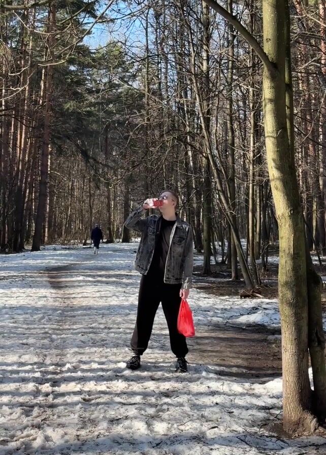 A man standing in a snowy forest drinks from a red can. He wears sunglasses, a gray denim jacket, black pants, and black shoes, and holds a red plastic bag in his left hand. He is centered in the frame on a path that is mostly covered in snow, with occasional patches of bare ground. The forest is dense with bare trees, except for a few pine trees visible in the background on the left. Another person, wearing a blue coat and dark pants, walks away from the camera in the distance on the path. The sky is visible through the bare tree branches. The lighting is bright, with strong shadows.