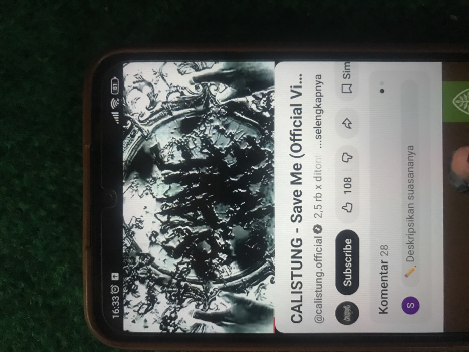 A smartphone with a dark brown case rests on a textured green surface, likely carpet or artificial turf. The phone's screen displays the YouTube application. The top bar shows the time 16:33, Wi-Fi and mobile network connectivity, and an 81% battery level. A video titled "CALISTUNG - Save Me (Official Vi...)" is playing, showing a still frame of a dark, abstract, and ornate design featuring multiple hands reaching from the sides within a circular, metallic-toned frame. Below the video, the channel "@calistung.official" is visible, with 2.5 thousand views. Interface elements include a "Subscribe" button, 108 likes, a dislike icon, share, and save options. The comment section is open, indicating 28 comments, with a prompt to "Deskripsikan suasananya" (Describe the atmosphere). A partial thumbnail of another video, showing a portion of a man's face and a green logo, is visible at the bottom of the screen. This scene is located in Bogor, Indonesia.