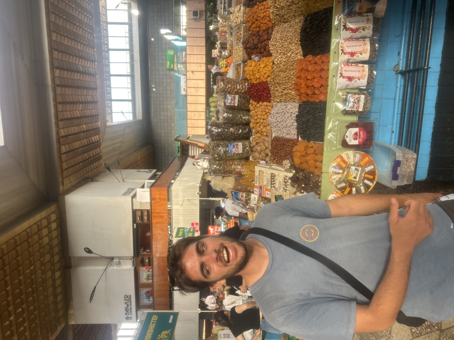 The image displays an indoor market scene at the Zelyony Bazaar (Green Market) in Almaty, Kazakhstan. In the foreground, a young adult male with dark hair and a short beard, wearing a light grey t-shirt and sunglasses on his head, smiles broadly at the camera. A dark strap from a shoulder bag crosses his chest. Directly behind and to his right is a market stall showcasing a wide variety of dried fruits and nuts, meticulously arranged in colorful, distinct piles and transparent bags on a light blue tiled counter. Visible items include various types of dried apricots, raisins, pistachios, almonds, hazelnuts, and sunflower seeds. Packaged goods are also displayed on the stall's lower shelf. The background reveals the market's expansive interior with a high, vaulted ceiling featuring a geometric patterned grid. Natural light streams in from large, elevated windows on the right. A multi-level structure is visible on the left, housing businesses; a sign for "BOWLER COFFEE ROASTERS" is prominently displayed on an upper level, flanked by decorative streetlights. Numerous other individuals are visible in the background, navigating the market.