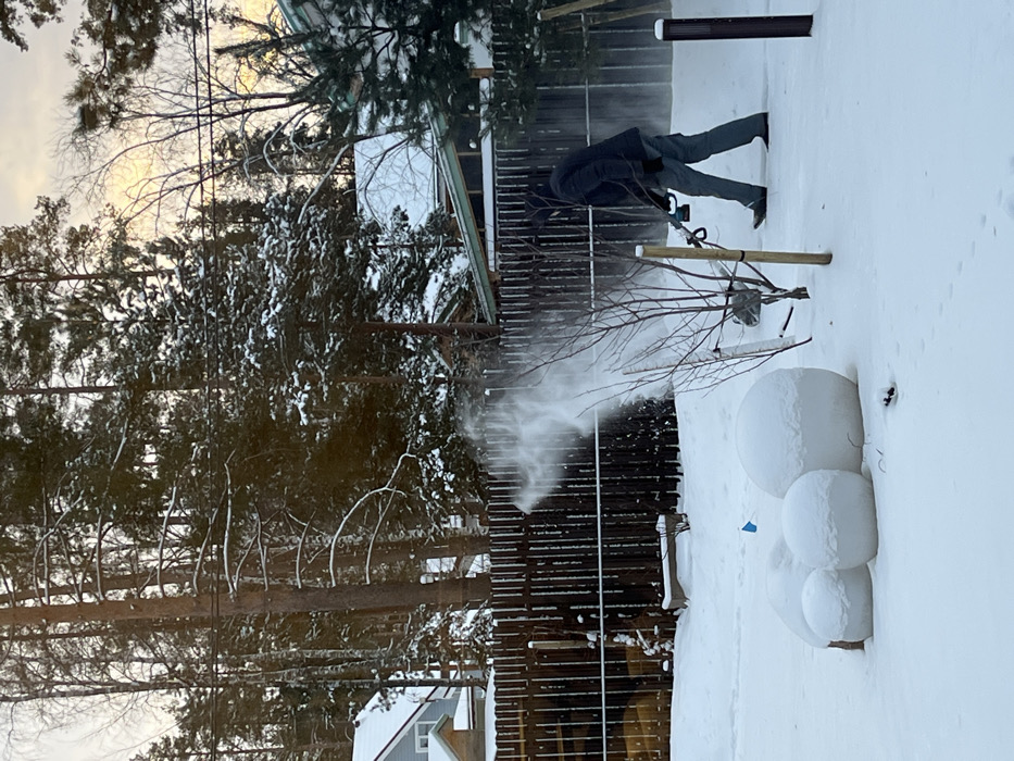 In Finskiy Briz, Russia, a winter scene unfolds with a male individual operating a cordless electric snow blower
