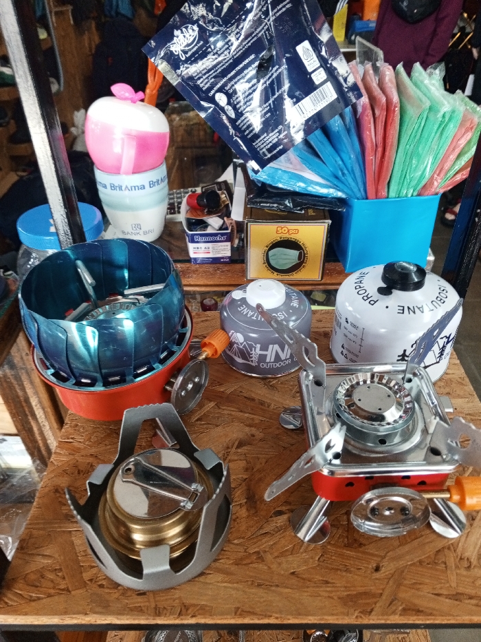 The image displays an indoor scene, likely a retail or storage area, in Baza, Myanmar (Burma). The primary focus is on an array of camping and outdoor cooking equipment arranged on a light-brown oriented strand board (OSB) surface. In the foreground, from left to right: * A portable camping stove consists of an orange metal base holding a blue metallic windscreen/pot support, partially revealing internal components. * Next to it, a silver-colored stand encloses a brass-toned alcohol stove burner with a reflective silver lid. * Two gas canisters are positioned upright: the left one is grey, labeled "HNM OUTDOOR" and "PROPANE ISOBUTANE"; the right one is white, also labeled "PROPANE ISOBUTANE." * To the far right, a compact, square-shaped portable gas stove in red and silver features foldable pot supports and an orange control knob. In the background, various items are visible on a higher shelf or surface: * On the far left, a clear plastic jar with a blue lid sits next to a stack of two cylindrical containers; the top container is pink and white with a pink decorative element, while the two lower ones are white with blue text "BritAma" and "BANK BRI." * Adjacent to these, a small blue box labeled "Hannochs HBC 4.3" is present. * A golden-yellow box marked "50 Pcs" and featuring an image of a green face mask is centrally located. * To the right of the mask box, a clear plastic bag holds an assortment of colorful plastic bags (red, green, blue) standing upright in a blue square container. * A larger, clear plastic bag with "Glade" branding is partially visible, hanging or placed above the other background items. The overall background consists of darker, indistinct shapes, suggesting shelves or additional stored items. No individuals are present in the scene.