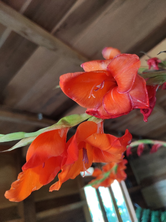 The image displays a close-up, upward-angled perspective of several vibrant orange-red Gladiolus flowers. Three prominent blooms are in the foreground, exhibiting ruffled petals with subtle color variations from a deeper orange-red to a lighter orange, and distinct light purple stamens visible within their throats. These flowers are attached to green stalks, with additional blurred flowers extending into the background. The upper portion of the background consists of a blurred wooden ceiling or roof structure, characterized by light brown planks or beams arranged diagonally. In the lower right corner, a blurred area of light blue and white indicates a window or an opening providing ambient light. No individuals, overt actions, or specific identifying markers for the city of Lán Tranh, Vietnam are discernible within the frame; however, the setting suggests an indoor or sheltered environment.