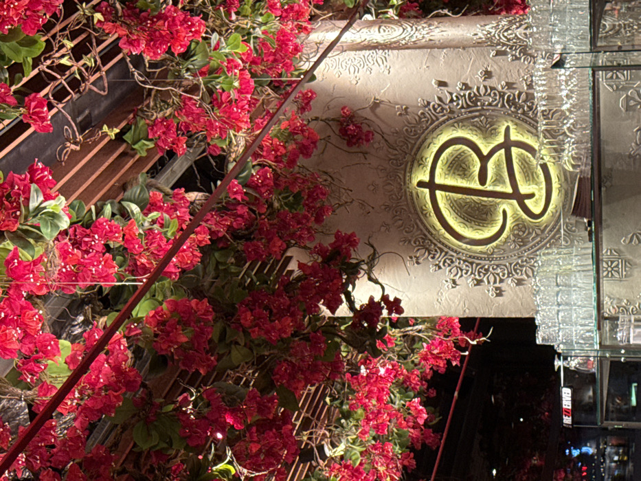 The image displays an interior scene of Bar B by Happy Bar & Grill, located in Sofia, Bulgaria. The upper portion of the frame is heavily adorned with artificial red bougainvillea-like flowers and green foliage, suspended from the ceiling and overhead structures, forming a dense canopy. Centrally positioned, a light-colored, textured column or pillar features intricate embossed patterns. On this column, a prominent circular frame encircles an illuminated yellow stylized cursive "B" logo. Below the logo, a glass bar counter holds numerous clear drinking glasses, some inverted and stacked, with additional wine glasses hanging from racks above the counter. To the lower-left, a red sign displaying "RESERVED" is partially visible on a dark, reflective surface. The lighting is atmospheric, illuminating the floral arrangements, the logo, and the glassware. No individuals are present, and no actions or interactions are depicted.