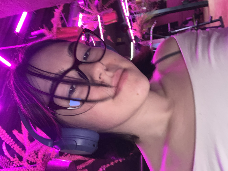 One female individual is depicted in a close-up, front-facing portrait, situated in Lymanka, Ukraine. She possesses dark hair, styled short with strands partially obscuring her forehead and cheeks. She wears dark-rimmed eyeglasses, with a distinct rectangular blue light reflection visible on her left lens. Blue over-ear headphones are positioned over her ears. Her expression is neutral, mouth closed. She is clad in a light-colored, off-the-shoulder top; a dark strap, possibly from an undergarment, is visible over her right shoulder. The background is blurred, illuminated by intense pink and purple neon lighting, casting a strong color hue across the scene. Linear light fixtures are discernible in the upper background. Dark foliage or plant decorations, also saturated in pink light, are intermittently visible. Faint metal structures, potentially gym equipment or architectural elements, are vaguely present in the right background. The environment suggests an indoor setting, possibly a leisure or fitness venue, characterized by its artificial, colored lighting scheme.