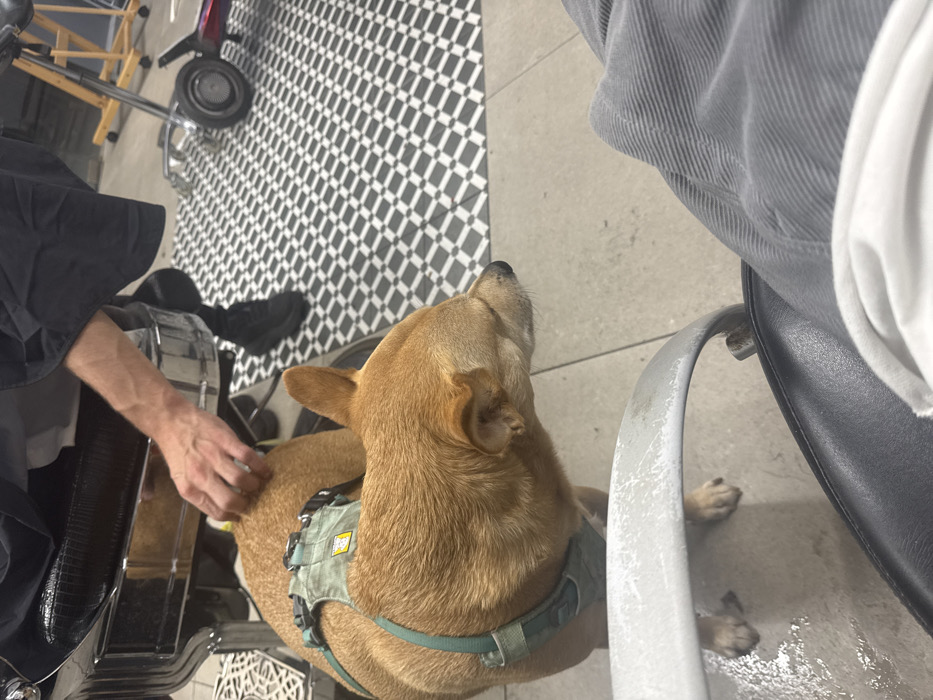 The image displays an indoor scene within a commercial establishment, identified as a barbershop in Tel Aviv, Israel. A light-brown, short-haired dog, wearing a green harness with a yellow tag, stands on a light grey tiled floor. A partially visible individual, presumed to be a barber, is seen from the chest down, wearing a black cape, dark pants, and dark shoes. This individual is petting the dog's back with their right hand. A black and chrome barber chair is positioned to the left of the dog. In the foreground, the lap and legs of a seated person, wearing gray corduroy pants, are visible, with a silver, scuffed chair armrest in front. The dog's head is turned to its right, and its eyes appear closed. The background features a distinct black and white checkered floor pattern and a metallic wheeled cart with a red component.