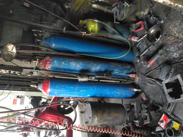 The image depicts an interior view of a cluttered workshop or industrial area. No specific identifying markers for the city of Elst, Netherlands, are visible within the frame. No individuals are present. The central foreground features three vertically oriented gas cylinders: two blue with red top bands, and one entirely blue, each equipped with regulators and hoses. A smaller, light green gas cylinder is partially visible behind the rightmost large blue cylinder. To the left of the cylinders stands a dark, cylindrical metal object. The background on the left reveals a partially visible red scooter or moped, showing its front wheel and side panel. The background on the right includes metal shelving and a hanging lamp with a metallic reflector. The floor is a dark, uneven surface, possibly concrete, extensively littered with various tools, metal scraps, wires, and debris. Notable objects on the floor include a red and grey angle grinder, a green and black power drill, a metal rectangular frame, a black pan containing a dark liquid, multiple red-capped bottles, and coiled hoses. The environment is characterized by utilitarian equipment, wires, hoses, and a general state of disarray.