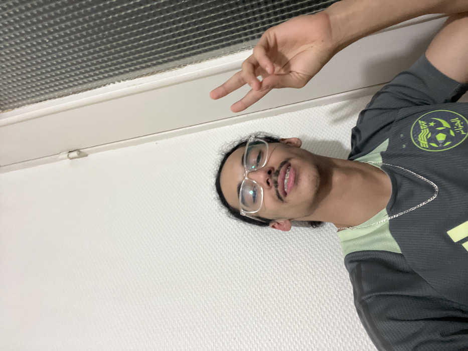 A young man lies sideways, grinning with braces visible. He wears clear glasses and a dark gray and green Algerian soccer jersey with a silver chain. He makes a peace sign. The background is a white textured wall, and a gray, translucent-covered light fixture is visible at the top of the frame.