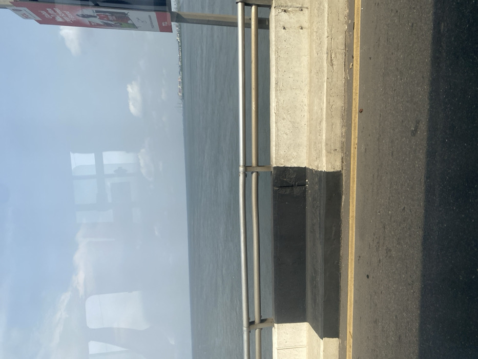 The image presents a roadside perspective from an elevated structure, likely a bridge, overlooking a large body of water near Ebute-Metta, Nigeria. The immediate foreground features a section of asphalt road with a solid yellow lane marking. A dark, elongated shadow crosses the lower left portion of the road surface. Adjacent to the roadway is a concrete barrier, with its left segment painted matte black and its right segment remaining unpainted light gray concrete. Above this barrier, a metal guardrail system, composed of two parallel horizontal bars supported by vertical posts, runs along the edge of the structure. Beyond the guardrail and barrier, a vast expanse of dark blue-gray water, appearing choppy, extends to the horizon. In the far distance across the water, a landmass is visible, featuring a low-rise skyline with several buildings and distinct tall, slender structures, possibly industrial chimneys or communication towers. The sky above is a light blue with scattered white clouds, appearing somewhat hazy. Reflections of window panes, forming a grid pattern, and other interior vehicle elements are superimposed across the upper portion of the image, indicating the photograph was taken through glass. A partial billboard on a vertical pole is visible on the far right, displaying a figure in a red shirt, text including "Global No. 1 brand," and the logo "TCL." No persons or specific dynamic actions are discernible within the frame.