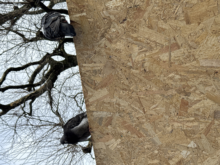 The scene is located in Belfast, United Kingdom. Two common pigeons are perched atop the upper edge of an Oriented Strand Board (OSB) panel that constitutes the foreground and lower two-thirds of the image. The panel exhibits the characteristic texture of compressed and resin-bound wood chips. The pigeon positioned on the left is oriented towards the viewer, displaying dark grey and lighter grey plumage. The pigeon on the right is oriented away from the viewer, showcasing its dark grey back and fanned tail feathers. Both birds appear stationary. The background features a dense network of bare, deciduous tree branches silhouetted against a light, overcast sky. No human subjects or discernible interactions are present within the frame.