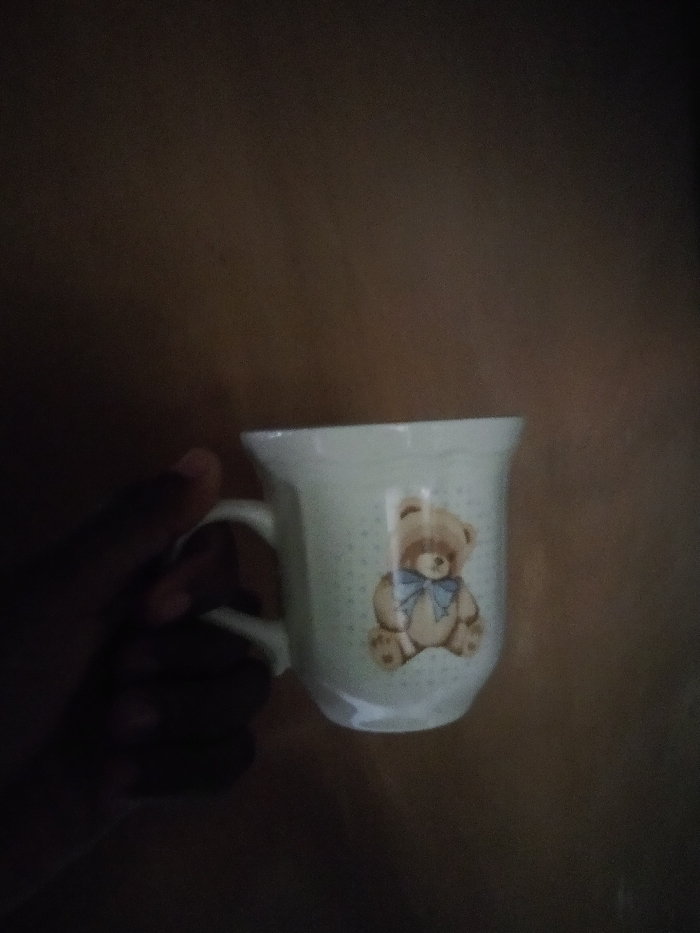 A hand holds a ceramic mug against a brown background. The mug is white with a light-green tint. It features a teddy bear graphic wearing a blue bow tie, surrounded by small, light-blue dots. The mug has a simple handle and a slightly flared top. The hand holding the mug is dark, providing a contrast to the mug's light color.
