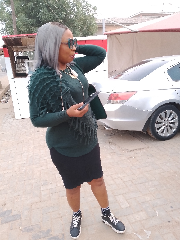 A woman with gray hair, wearing a dark green sweater, black skirt, and black and white sneakers, stands outside holding a smartphone
