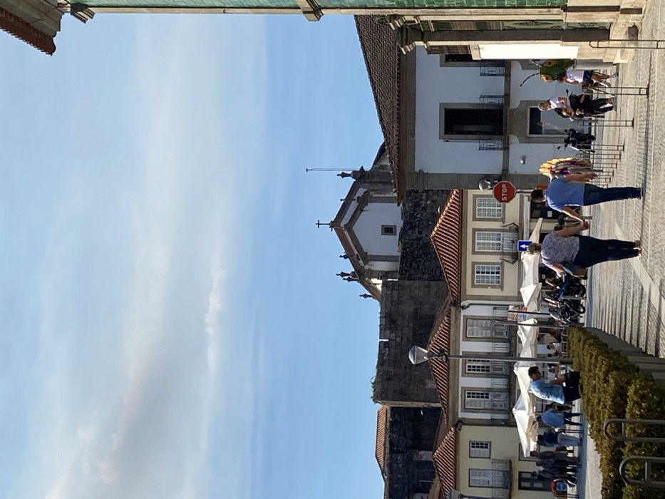The image depicts a bustling street scene in Vila Nova de Cerveira, Portugal, on a clear day with scattered white clouds