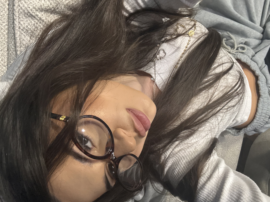 The image displays a close-up, high-angle portrait of a single individual, identified as female, within an indoor environment. The specific location within Yerevan, Armenia, cannot be determined from the visual evidence. The subject has long, dark brown hair parted on the side, extending over her shoulders and chest. She wears dark, oval-framed eyeglasses, through which her dark eyes are visible, directed towards the camera. Her lips are full and appear to have a glossy, light pink hue. She is dressed in a light-colored, ribbed long-sleeve crop top that reveals a portion of her midriff, combined with light grey drawstring sweatpants. Accessories include a silver-colored chain necklace with a heart pendant and a gold-colored layered necklace featuring small beads and a circular medallion. The background is an indistinct light grey textured fabric, possibly upholstery or bedding, with a zipper-like detail visible on the upper right side. The individual is stationary, posing for the photograph.