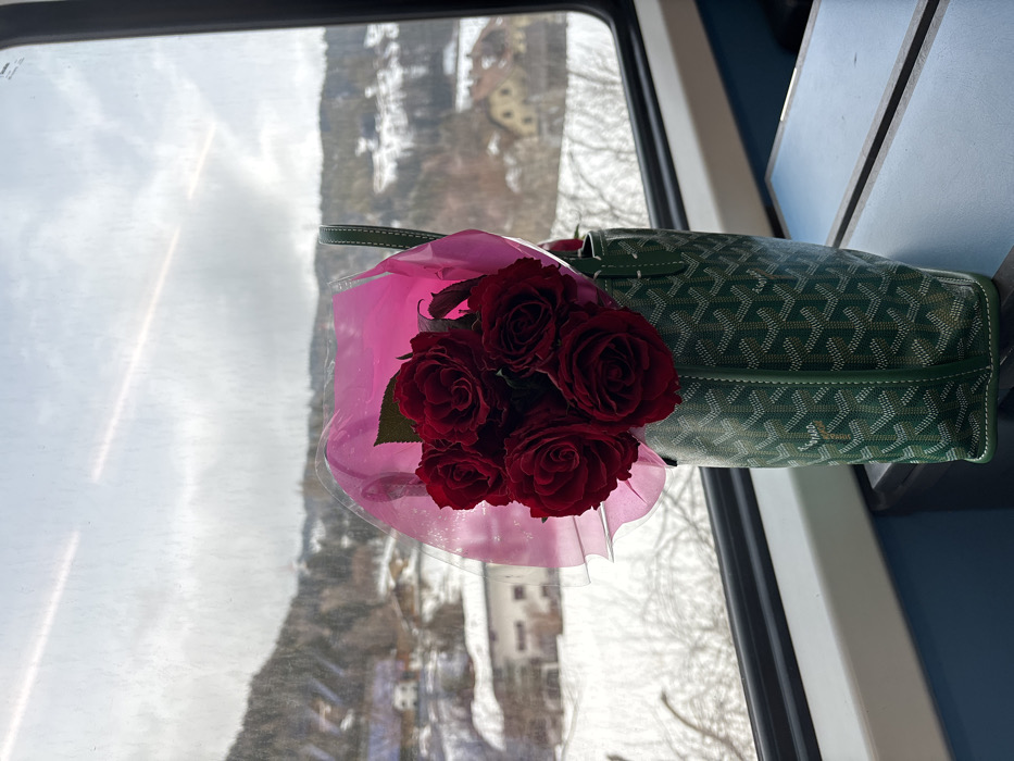 The scene is an interior view from a train traveling through a snow-covered mountainous landscape in Flirsch, Austria. In the foreground, a dark green Goyard Saint Louis tote bag with its signature chevron pattern rests on a light blue flat surface, positioned beneath a train window. The bag contains a bouquet of five dark red roses, wrapped in clear plastic and pink tissue paper. Through the train window, a winter environment is visible, featuring snow-laden ground, bare deciduous trees, and evergreen trees on hillsides. Several residential buildings with snow-covered roofs are present among the trees. The sky is overcast and grey-white. Faint linear reflections are present on the window glass. No individuals are visible.