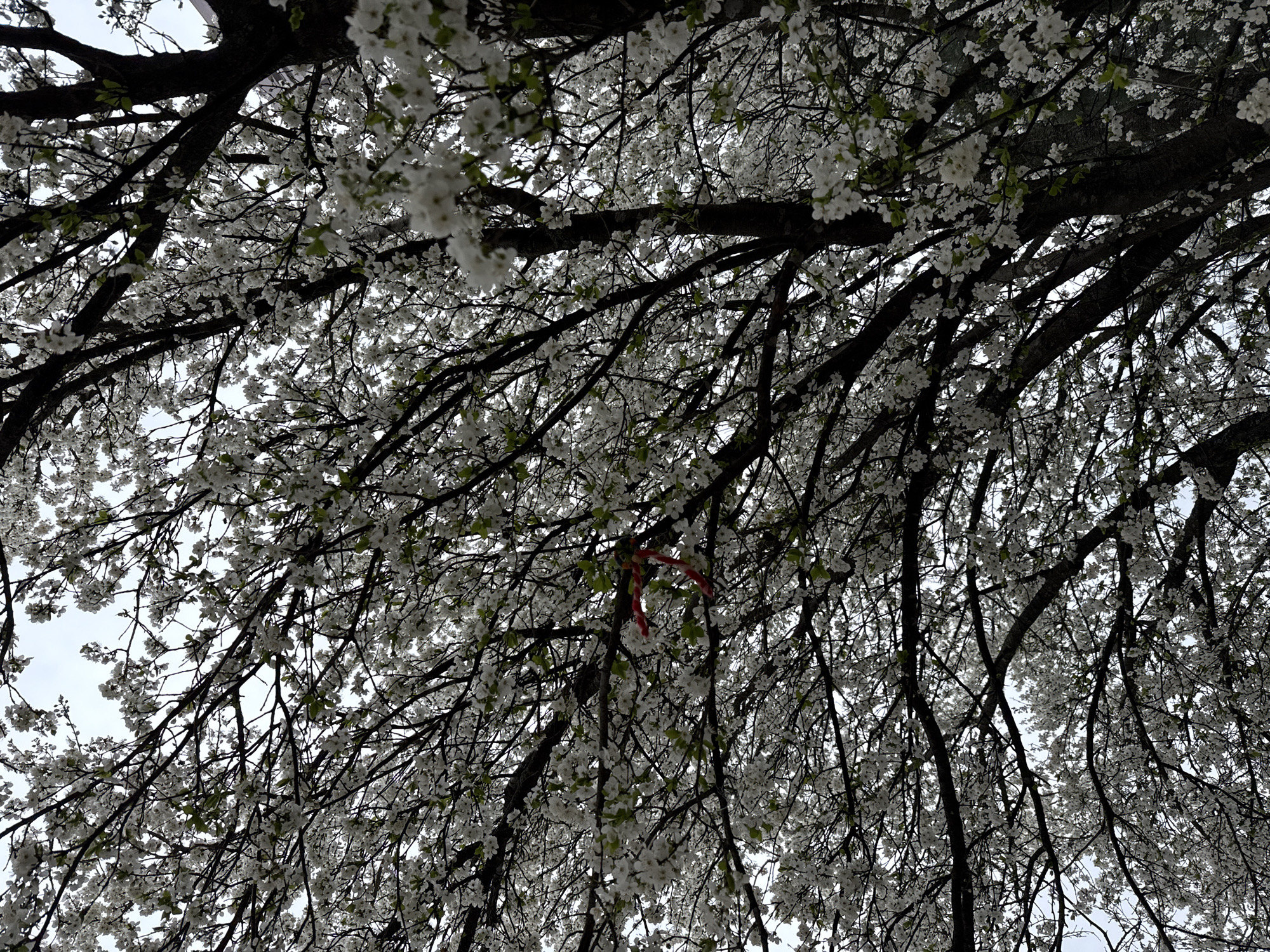 The image is a low-angle shot of a tree with white blossoms, possibly taken in Sofia, Bulgaria. The tree's branches fill the frame, creating a dense network against a light sky. In the center of the image, a red and white object hangs from one of the branches. The scene lacks people, subjects, or interactions.