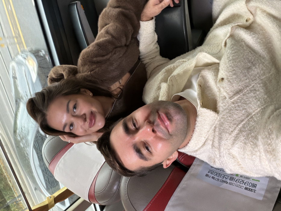 A man and a woman pose together inside what appears to be a bus or train. The woman, wearing a brown fur jacket, rests her head on her hand. The man, dressed in a cream-colored textured jacket, lies next to her. The background reveals a window with a blurry street view. A seat cover with Korean text is visible on the bottom right. The overall image composition suggests an intimate or travel snapshot.