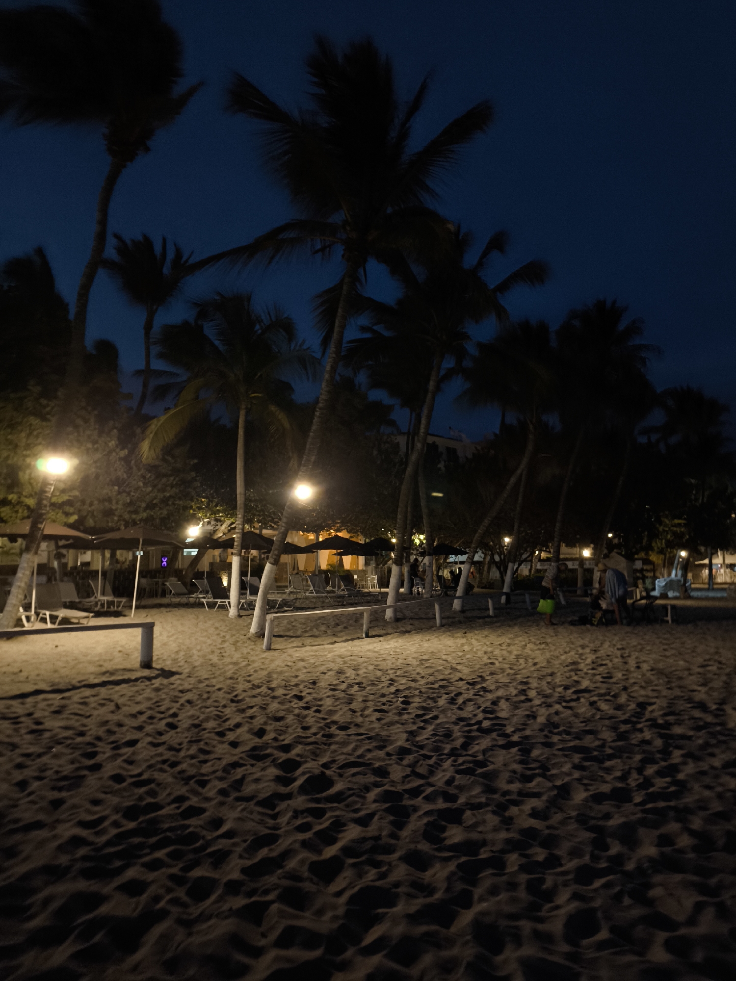 This is a nighttime image of El Yaque Beach in Venezuela. The scene is dimly lit by overhead lights and the afterglow of sunset on the horizon. The foreground shows a sandy beach, its texture detailed by visible footprints and small formations. The beach is sparsely populated with people strolling, relaxing on beach chairs under umbrellas, and gathered in small groups. In the background, palm trees rise, their silhouettes stark against the dark sky. Some trees have their lower trunks painted white. Scattered benches and tables hint at a beachside establishment. The overall mood is calm and serene.