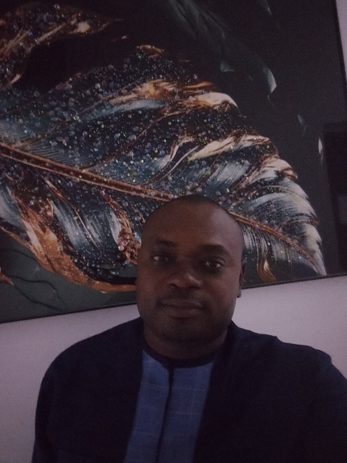 A man with dark skin and a shaved head is looking directly at the camera. He wears a dark jacket over a blue collared shirt. Behind him is a framed painting of a feather in dark blues, golds, and silvers. The painting appears to have glitter or crystals embedded within it. The background is a plain white wall. The lighting is somewhat dim, resulting in slightly grainy image quality.