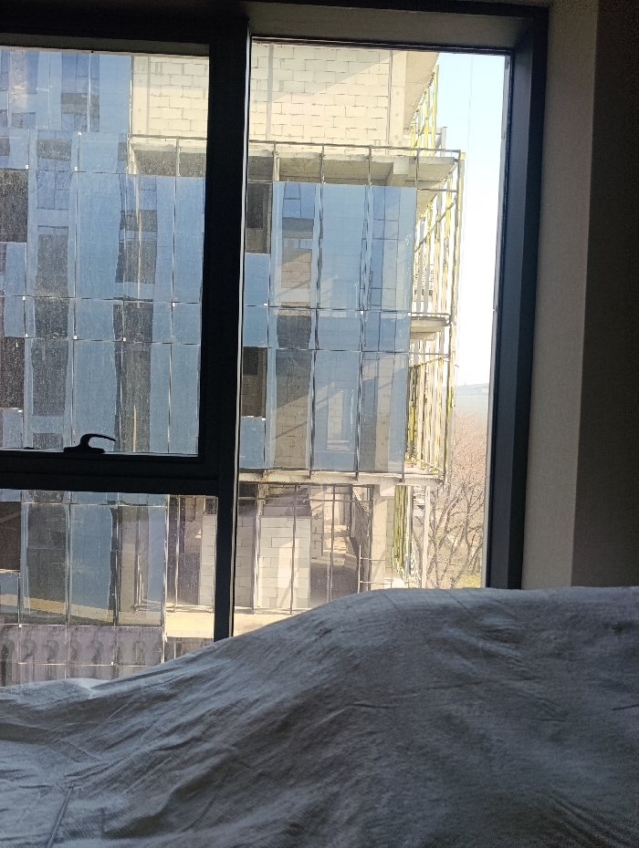 The image displays an interior view through a dark-framed window in Tashkent, Uzbekistan, looking out at an urban environment under clear daylight. The foreground features a substantial mass of rumpled, light grey fabric, consistent with bedding, obscuring the lower portion of the window sill. Beyond the window, a multi-story building, appearing to be under construction or renovation, dominates the scene. This building exhibits sections of exposed light-colored blockwork and a facade composed of numerous small, reflective panels that display a bluish hue from sky reflection. Extensive metal scaffolding is erected along the building's exterior. To the right, a sparse cluster of bare deciduous trees is visible against the clear sky. No individuals are depicted in the scene.
