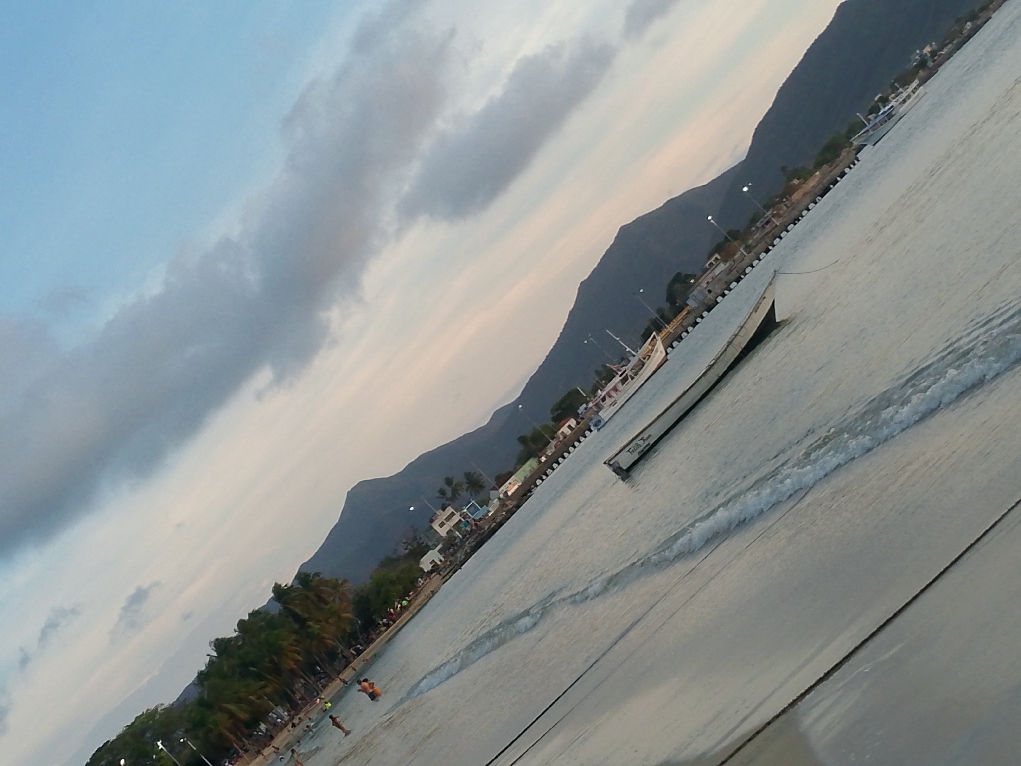 coastal scene in Juan Griego, Venezuela. Mountains are visible in the background, with a shoreline featuring trees and buildings. Several boats are docked along the shore. In the water, waves are forming and people are wading or swimming. The sky is overcast with clouds.