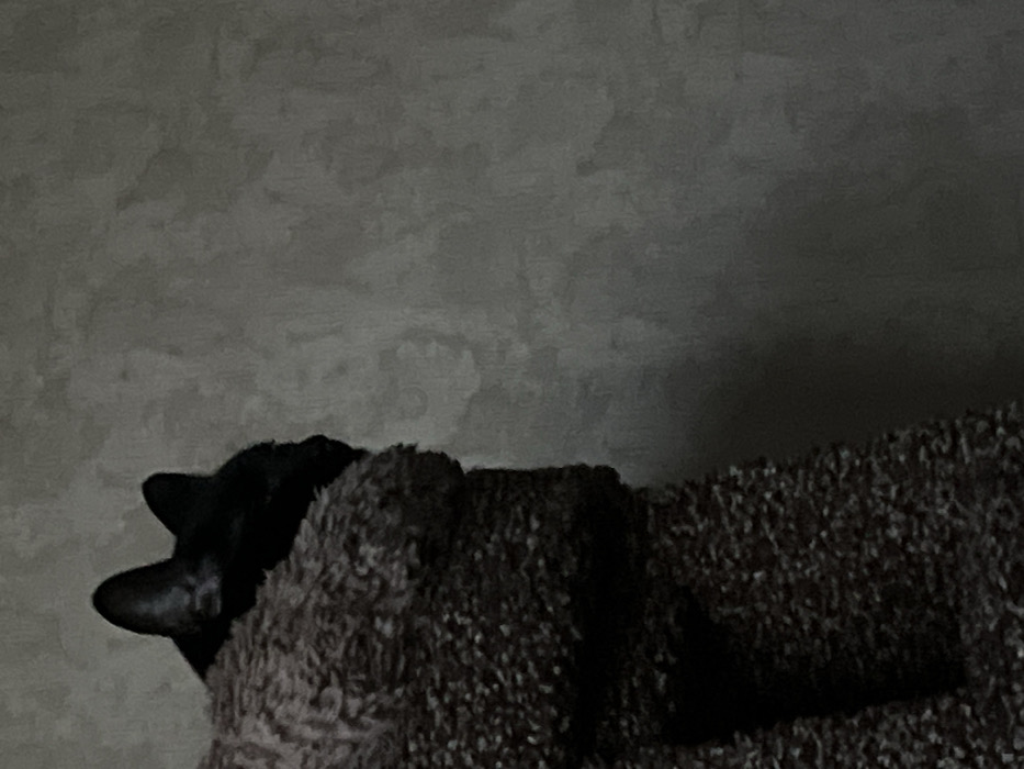 An interior residential setting within the city of Unknown, Unknown. A solid black domestic short-haired cat is positioned behind the top section of a multi-tiered cat tree or similar upholstered furniture, covered in dark brown, coarse fabric. Only the cat's head and upper back are visible above the furniture's edge, with the cat facing towards the right side of the frame. The background is a textured light grey wall. The scene is dimly lit. No human subjects or direct interactions are visible.