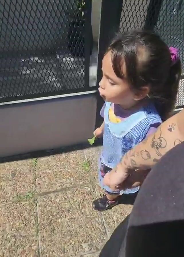 A young girl walks across a tiled walkway while holding an adult’s hand. The girl is wearing a blue and white pinafore over a purple shirt, and black shoes. Her dark hair is pulled back in a ponytail secured with a purple scrunchie. She holds a green leaf in her other hand. The adult is wearing a black shirt and shorts, and has several tattoos on their arm. A black metal fence is on the left side of the frame. The sun casts shadows across the walkway.