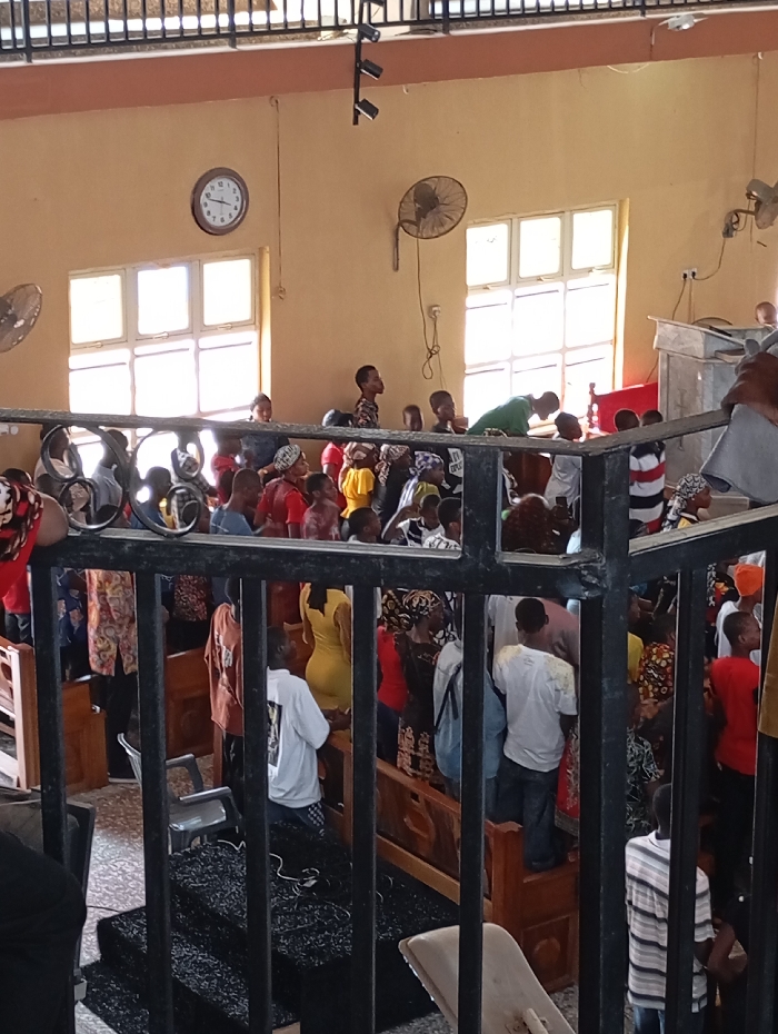 The image depicts an indoor gathering of approximately fifty to sixty individuals within what appears to be a hall or church in Onitsha, Nigeria