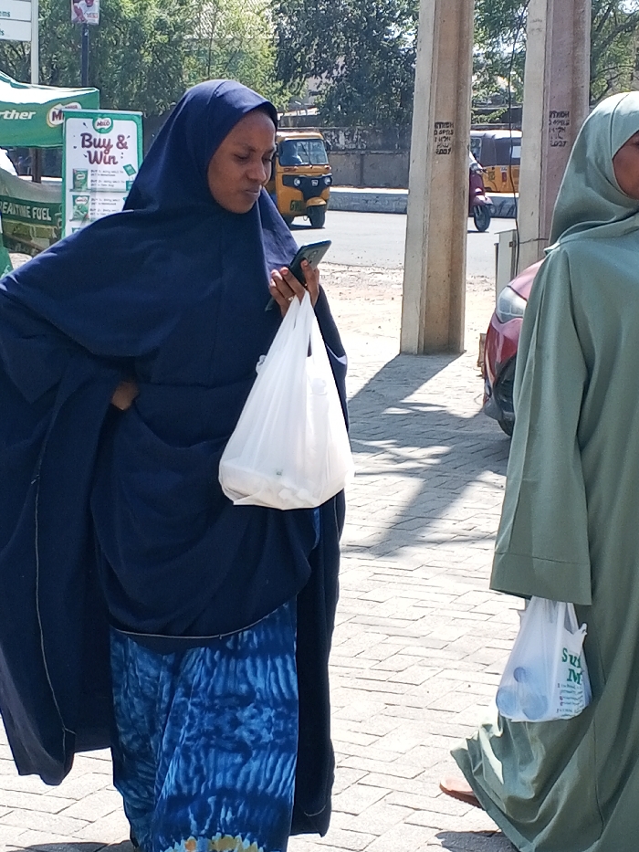 This image depicts a sunlit urban street scene in Tarauni, Nigeria, featuring two women on a paved sidewalk. In the foreground, a woman with light brown skin, wearing a dark blue hijab and a matching full-length abaya, is visible from the waist up. She holds a black smartphone in her right hand, actively looking at its screen, and a white plastic shopping bag hangs from the same hand, containing light-colored items. A patterned blue and white lower garment is visible beneath her abaya. A silver-colored ring is present on her right ring finger. To her right, partially obscured, is another individual wearing a light green full-length abaya and a matching light green hijab. Only their right side is visible, angled away from the viewer. They hold a white plastic shopping bag with "SUYSMART" visible on it, containing several round, possibly metallic objects. A brown sandal is visible on their right foot. The sidewalk is composed of light-colored rectangular pavers. Distinct shadows from utility poles and the individuals are cast on the ground, indicating bright sunlight. In the background, a tarmac road is visible with two yellow auto-rickshaws (Keke Napep) present. One is distinct on the left, while another is partially obscured further down the road. A red car's rear bumper and wheel are partially visible between the two women. Utility poles with visible text, possibly "APPLES" and "2023", stand on the sidewalk. On the far left, a green and white "Milo Buy & Win" promotional stand is partially visible, along with a green sign fragment that reads "PEARTIME FUEL". Trees and sparse vegetation line the background, indicative of an urban environment.