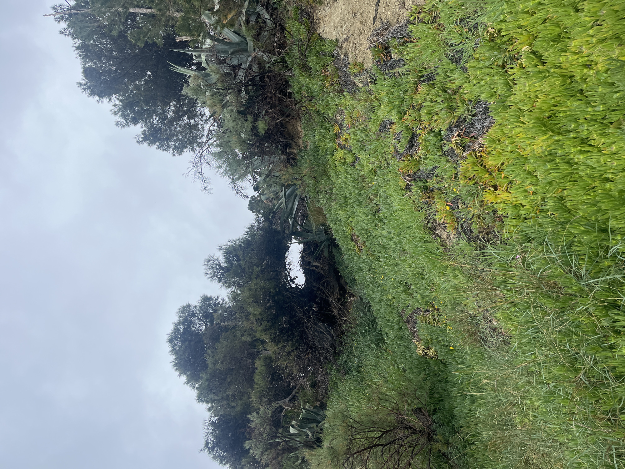 The image depicts an overgrown natural hillside in Split, Croatia, characteristic of coastal or park areas such as Marjan Hill. The foreground features a steep, upward-sloping terrain densely covered by light green succulent groundcover, consistent with ice plants (*Carpobrotus edulis*), interspersed with taller green grasses and smaller, scrub-like bushes. Patches of the succulent vegetation display yellowish tints, and scattered darker, possibly desiccated plant material is visible on the slope. The midground and background show the slope ascending towards a thick canopy of dark green evergreen trees, appearing coniferous, and several large *Agave americana* plants are prominently situated among them. A natural archway, formed by the interlocked branches and foliage of the trees, is visible in the upper-mid portion of the image. The sky, occupying the upper third of the frame, is uniformly light grey and overcast. No individuals, animals, man-made structures, or specific actions/interactions are present in the scene. The lighting is diffused, indicative of an overcast day.