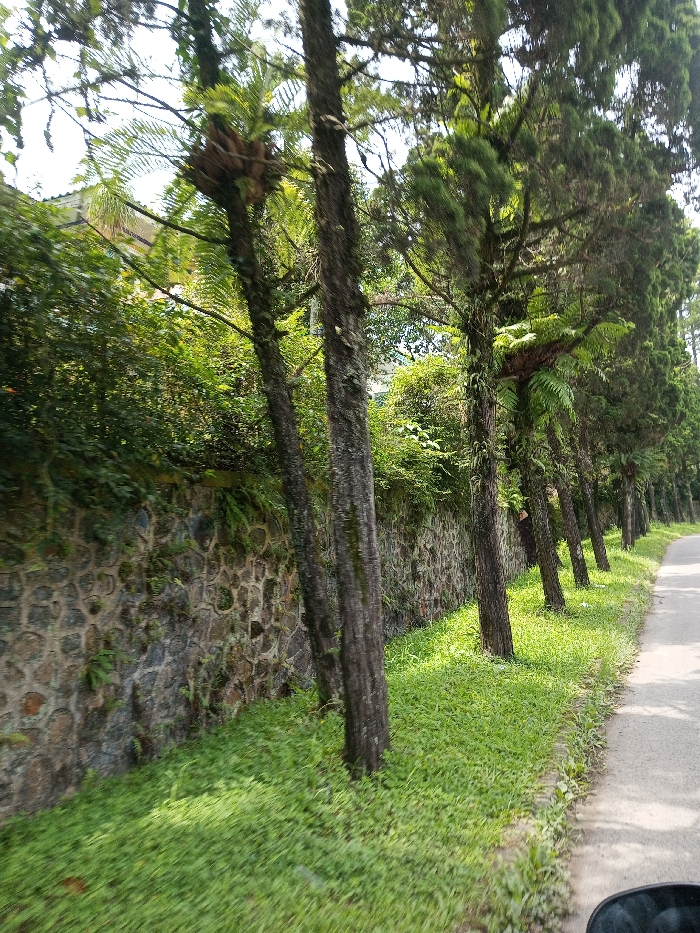The image captures a roadside scene in Vieng Phouka, Laos. A grey asphalt road occupies the right side of the frame, extending from the foreground into the background. A dark, curved object, resembling a vehicle's front fender or fairing, is visible in the bottom right corner. To the left of the road, a strip of vibrant green grass runs parallel to the pavement. Beyond the grass, a row of tall, slender trees with dark, textured trunks and dense green foliage lines the path. Several of these trees exhibit epiphytic ferns growing on their trunks and branches. Further to the left, behind the trees, stands a robust stone wall constructed from irregularly shaped, varied-color stones bound with mortar. Patches of moss and small green plants adhere to the wall's surface in multiple locations. Dense, lush green vegetation, including various shrubs and trees, grows profusely behind and above the stone wall. In the upper left background, partially obscured by the foreground trees and vegetation, a light-colored building with a dark roofline is discernible. The sky, visible through the tree canopy, appears bright and diffused. No individuals or animate subjects are present, and no active interactions are depicted within the scene.