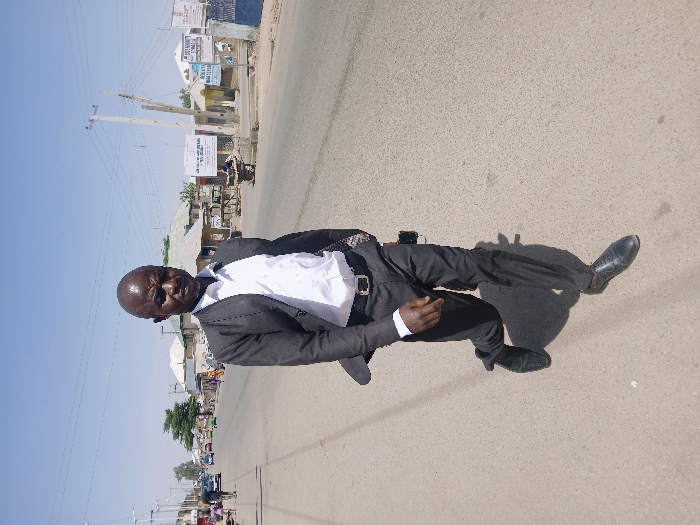 The image displays an adult male in a dark grey suit walking on a paved road in Ghanzi, Botswana, under a clear blue sky