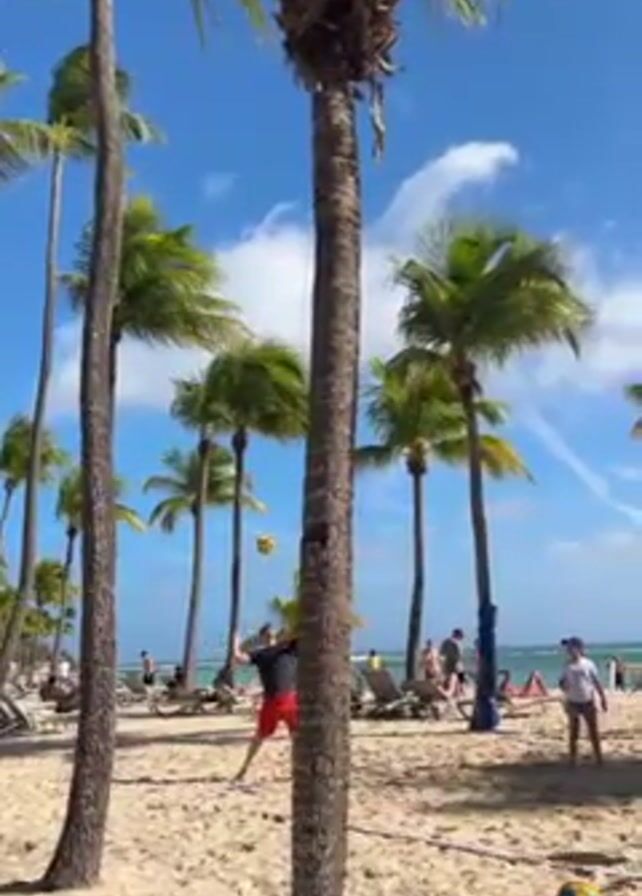 A sunny beach scene features people playing volleyball near palm trees and the ocean
