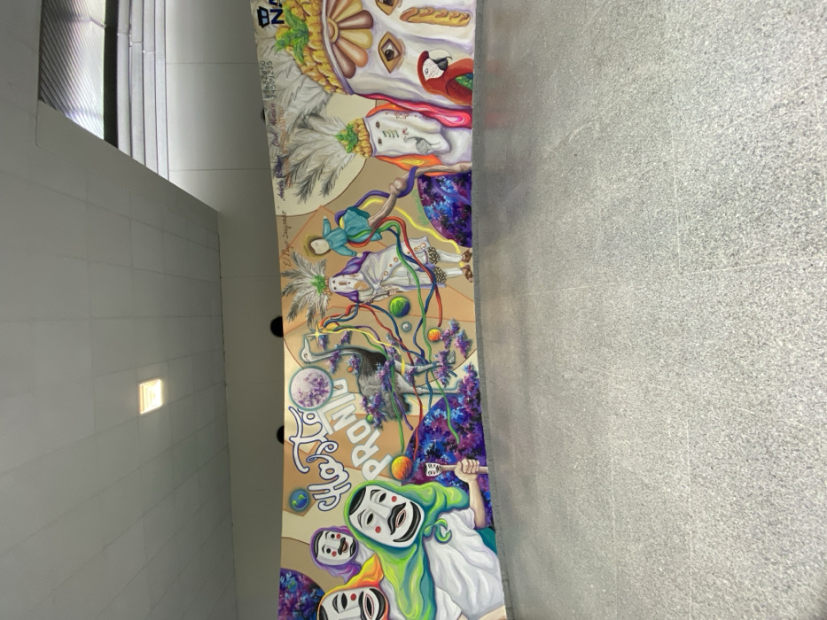 The image displays a vibrant, multi-panel mural spanning a slightly curved wall within an indoor public space in Municipio Warnes, Bolivia