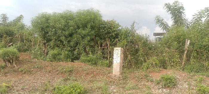 A dirt road is lined with thick greenery and trees under a cloudy sky. A small, concrete marker stands beside the road, displaying illegible characters. In the background, amidst the dense foliage, a sign is barely visible. Some wooden poles are visible near the right side of the image.