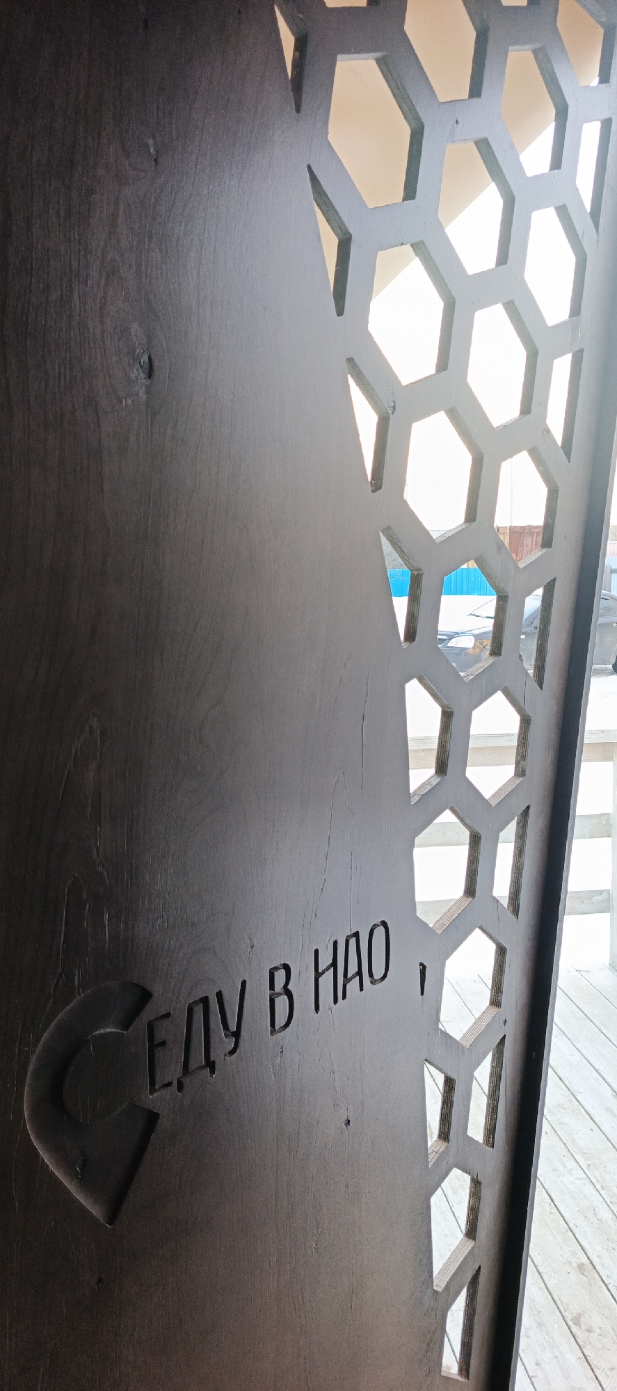 A close-up shot reveals a dark wooden panel with a honeycomb-patterned cutout on the right side, offering glimpses of a bright outdoor scene. The panel is inscribed with the Russian text "Еду в НАО," accompanied by an arrow pointing left. This translates to "Going to NAO," where NAO is an abbreviation for Nenets Autonomous Okrug, a federal subject of Russia located in the Arctic region. The photograph appears to have been taken in the city of Iskateley, Russia, as indicated by the text on the panel, which suggests a journey towards the NAO. The backdrop visible through the cutouts hints at an outdoor setting with a wooden deck and glimpses of vehicles and building.