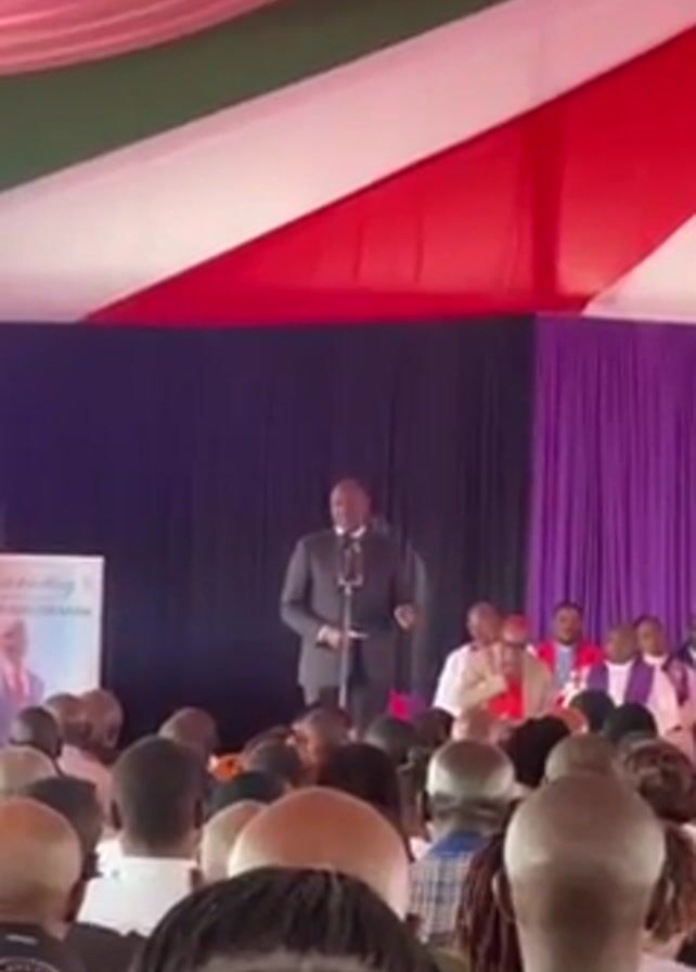 A man in a suit is speaking at a podium on a stage. He is surrounded by people seated behind him, some of whom are wearing clergy robes. In front of the stage, there is a large audience. The stage is decorated with red, white, and green fabric draping. A poster is visible to the left of the speaker. The video is taken from the perspective of someone in the audience.