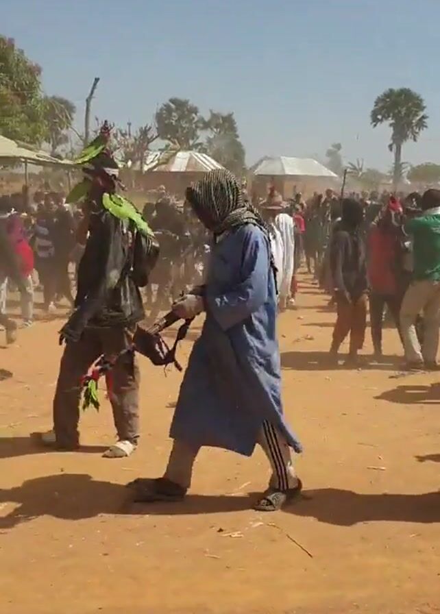 crowd of people on a dirt road in a rural setting. The environment appears dry and dusty. Many of the people are moving around, some walking, some dancing. A few people are dressed in what appear to be costumes, one with a mask. There are explosions that generate white smoke. There are houses visible in the background, and some trees. Several children are visible in the foreground, including one wearing a red and white soccer jersey. Overall, the scene appears chaotic, with a sense of celebration or unrest.