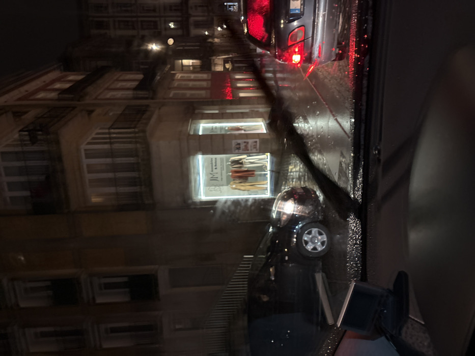 Rain splatters a windshield in a nighttime city scene. A car with lit taillights is ahead. The buildings across the street are visible, reflecting light and showing window details. A scooter is parked nearby. A storefront with illuminated displays featuring clothing is seen through the wet glass. The scene is blurry and distorted by the rain.