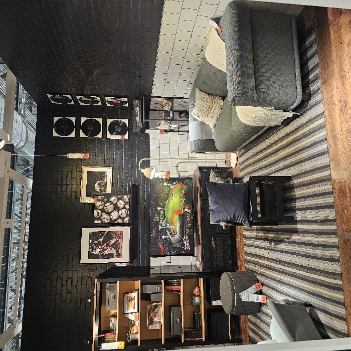 A living space displays a gray sofa with throw pillows, resting on a striped rug. Nearby are a dark square side table and a blue velvet cushion. The wall features black brick and white tiles, adorned with framed art and vinyl records. A shelving unit holds books and decorative items, with a framed picture of a baseball game hung above. A floor lamp lights the scene.