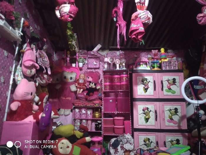 This image depicts a densely packed interior room, predominantly themed in pink, located in Cipinang, Indonesia