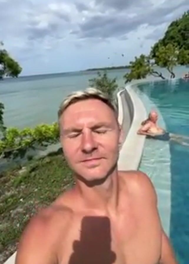 A medium shot shows a fair-skinned, shirtless man standing in front of an infinity pool, taking a selfie. The man has short, light blond hair. Initially, his eyes are closed, but he opens them and smiles. He then raises his hand to his forehead, shielding his eyes from the sun, while maintaining his smile. In the background, another fair-skinned man floats in the pool, further away. Beyond the pool, there is a body of water, possibly the ocean, with visible shoreline and some greenery. The sky is partly cloudy. The man's shadow is visible on his chest and stomach.
