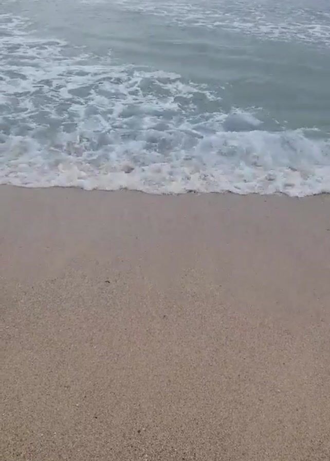 beach with a sandy shore and waves gently rolling in. The water is a light blue-green color, and there are whitecaps on the waves. The sand is a tan color. The sky is overcast.